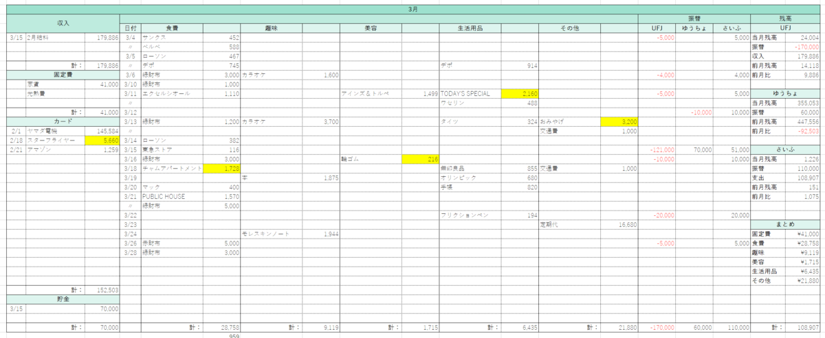 出費の記録を一日ごとにつける(3月19日に本を買った、など)ことで、「きちんと記録している感」は出るのですが、この「やってる感」があくまでも気分の問題でしかない、というのがだいぶ厄介なポイントだと思います。